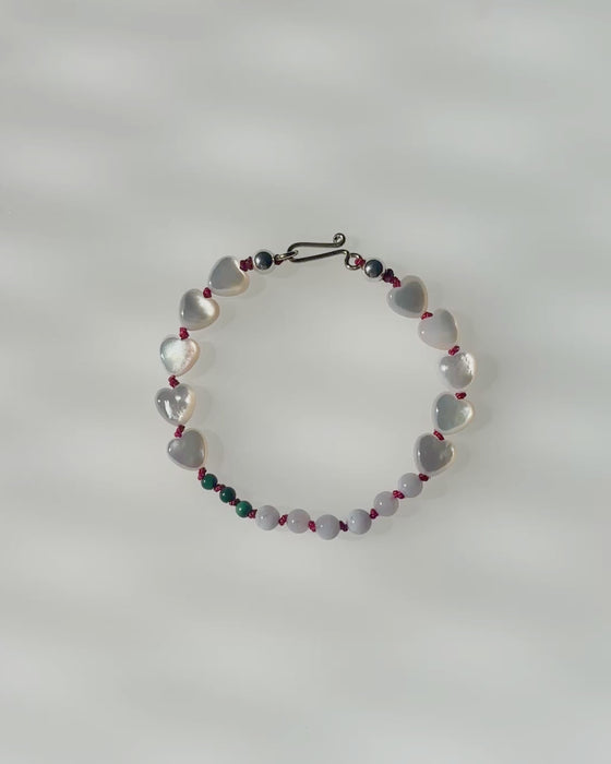 A trinity of mother of pearl hearts, blue lace agate, and malachite reflects balance through gentle protection, clear communication, and grounded transformation.